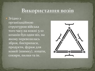 Він складався із возів, скріплених ланцюгами, розташованих чотирикутником, півмісяцем або овалом. Спереду, ззаду і з боків табору розміщували гармати, а в середині цього укріплення перебувало військо. Під час наступу піхота виходилав захисне кільце. Головне призначення табору возів прикриття від атак кінноти і списоносців. Іноді використовували й інший бойовий порядок. Козацьке військо могло змішуватися з ворожим. Такий бій називали галасом.