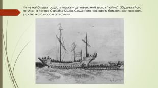 Січ мала флот, який складався з легких, маневрених човнів - чайок. Вони рухалися за допомогою весел або вітрил, залежно від погодних умов. Чайки мали перевагу над іншими суднами, бо могли пришвартуватися до будь-якого берега. До кожного кінця човна прилаштовували окреме стерно, завдяки чому чайка в будь-який час могла змінити курс на 180 градусів. У таких суднах козаки зберігали провіант, боєприпаси, зброю.