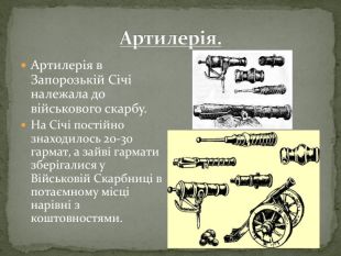Мали козаки також важкі й легкі гармати для облоги і захисту. За якщо довжина воза дорівнює 2 м. Запорожці віддавали перевагу шаблі над іншою зброєю. Леза шабель вкладали у дерев’яні обшиті шкірою чи обкладені металом піхви (в