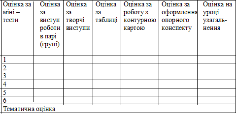 У дану таблицю учитель виставляє оцінки після кожного уроку та після уроку узагальнення